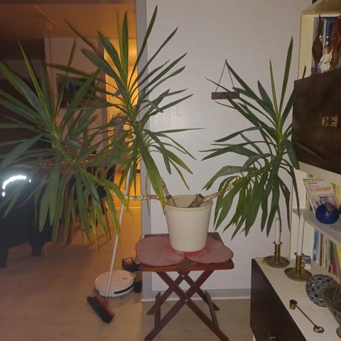Indendørs plante med grønne blade i en hvid rund potte. Potten er lavet af et solidt materiale og indeholder jord med et lag af små sten på overfladen. Planten er egnet til indendørs brug og kan bidrage til at forbedre luftkvaliteten og dekorere rum. Krukker størrelse b 53 cm, h 36 cm med indbygget hjulene. Blomster højde 85 cm. Kontant betaling.