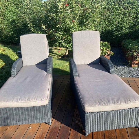 Sort solstole i polyrattan med mørke grå hynde. Har aldrig været brugt, men har stået ude. Hynden har kun været opbevaret indendørs.