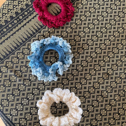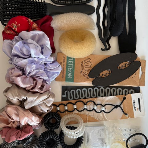 Hårelastikker, scrunchies er hjemmesyet i forskellige materialer jvf fotobeskrivelserne.