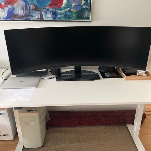 Buet skærm i monsterstørrelse på 49 inch. Den Den horzontale opløsning gør, at man kan har 2.5 almindelige skærme ved siden af hinanden, hvilket gør effektiv arbejde utrolig meget nemmere. Skærmen har indbygget USB-hub, dvs. du kan tilslutte din laptop med én USB-C ledning og så er din laptop ikke bare forbundet med skærmen, men også oplader, netværk og extern mus/keyboard, mv..