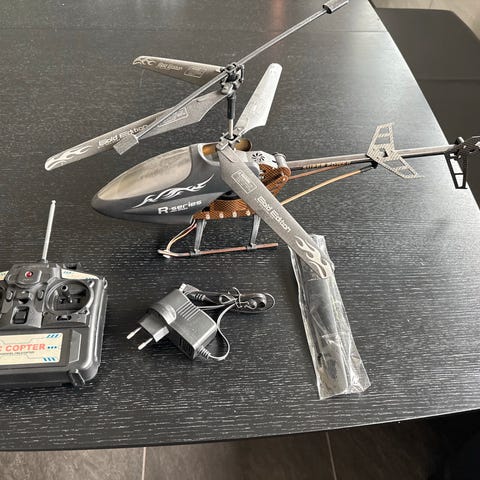 F-Series F39 radiostyret helikopter med blå og gul farge. Inkluderer fjernkontroll og ekstra deler. Designet for fjernstyrt flyvning og modellhelikopterentusiaster.
