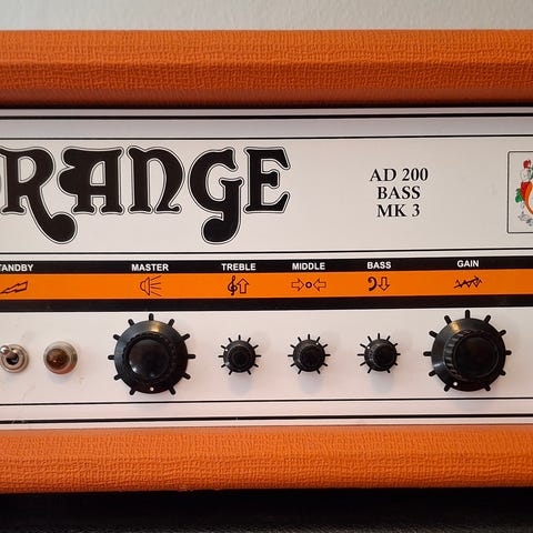 Orange Terror Bass top – 500 W hybridforstærker (rør-preamp + klasse D power). Masser af varme, punch og klassisk Orange-lyd.