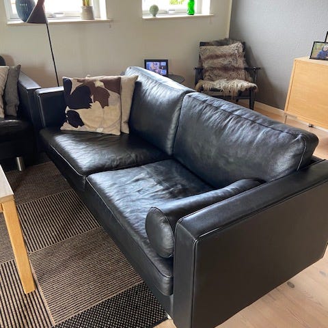Korpus i sort læder, puder i stof Steelcut 253. Sofaen er velholdt; har stået i hjem uden røg, børn eller husdyr.