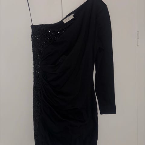 Ternet kjole i sort/gylden. Materiele: 46% polyester, 42% viskose, 12% polyamid. Dejlig blød med stræk. Sort foer i pufærmer. Ingen gennemskin i kroppen. Lang lynlås i ryger, fine knapper i nakken.