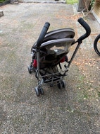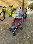 Maclaren klapvogn med rød og grå farve. Letvægtsdesign. Velegnet til børn og nem at manøvrere i bymiljøer. Udstyret med flere hjul for stabilitet og komfort.