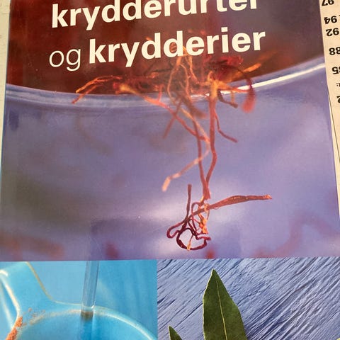 Urte- og krydderibog med fokus på forskellige urter og krydderier. Bogen indeholder information om anvendelse, typer og egenskaber ved urter og krydderier, illustreret med billeder af forskellige krydderier som chili, kanel, og andre tørrede urter. 18.2.7