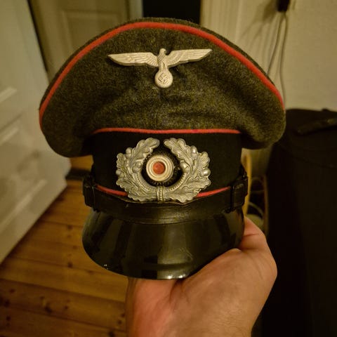 Det ene våbenmærke er faldet af skulderklappern, men medfølger selvfølgelig.