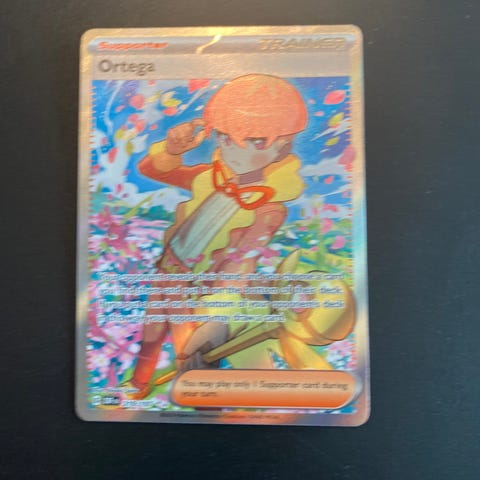 Pokémon Ortega Trainer kort med farverigt design og tekst på forsiden. Kortet er af standard størrelse og egnet til samling eller spil.