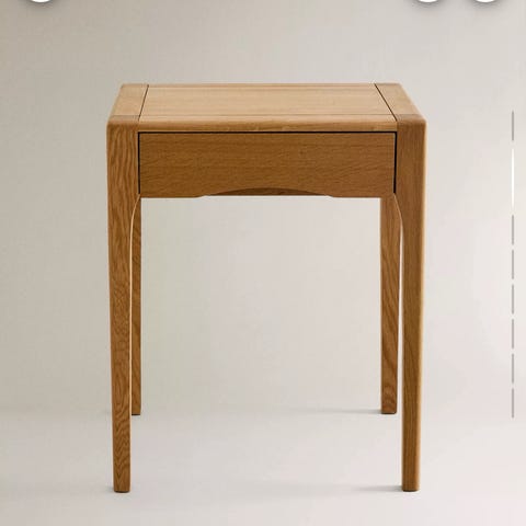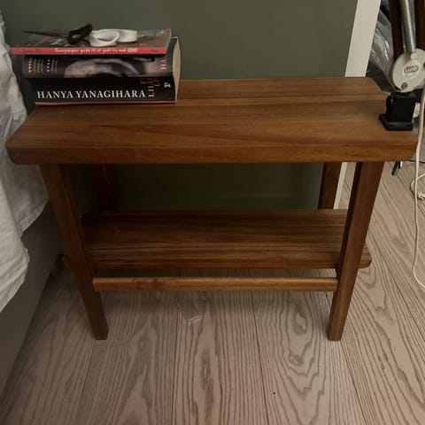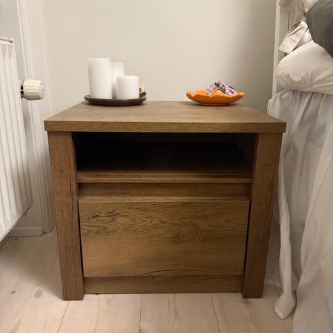 Sengebord i massivt fyrretræ og naturlig rattan brun