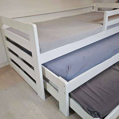 Lakeret krydsfiner træseng med skumgummimadrasse. (B 66 - L 90)CM. Kan blive ca. 150cm.