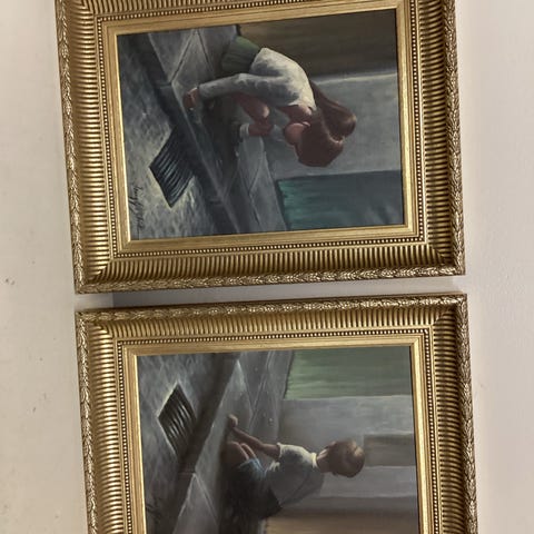 Tre signeret malerier af portrætter af børn med forskellige udtryk. Malerierne er indrammet i sorte trærammer med glas. Motiverne viser børn i forskellige aldre og tøjfarver, herunder en pige med lyserød sløjfe og trøje, en dreng i jakke og skjorte, samt en pige med langt lyst hår og rød trøje. Malerierne kan anvendes som dekorative vægkunst i hjem eller kontor.