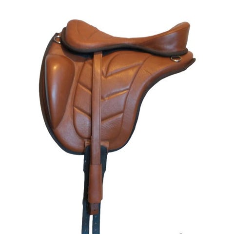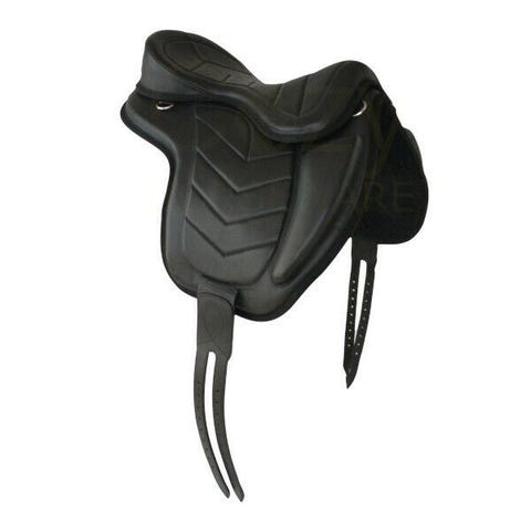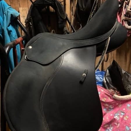 CWD sadel i sort læder. Sadelens design og materiale er egnet til ridning. Fremstillet i Schweiz, som angivet på sadelens mærkat. Inkluderer læderstropper og metalbeslag til fastgørelse.