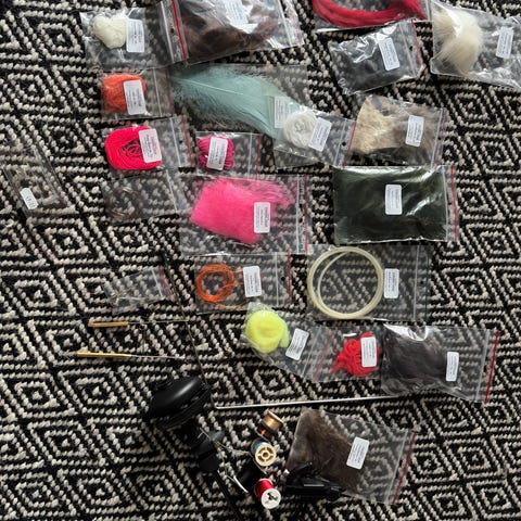 Fluebindingssæt med kroge, fjer, lak og skruetving. Kom igang med at lave dine egne fluer på ingen tid.