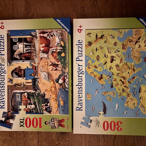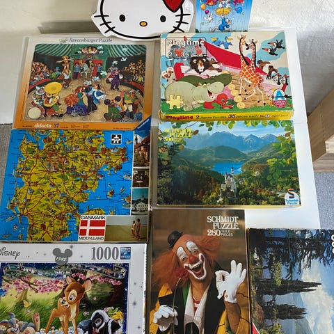5 puslespil med 100 brikker og et med 112 brikker. Brugte men i god stand.
