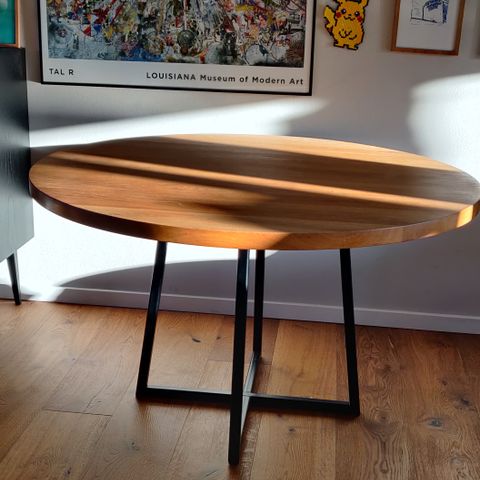 Eberhart, Hector. Rundt, gråt i gråt spisebord. 140 cm uden tillægsplader, stålben. Pladen med en del hakker på kanten fra tidligere fejlslagen transport. Dermed rustikt udseende.
