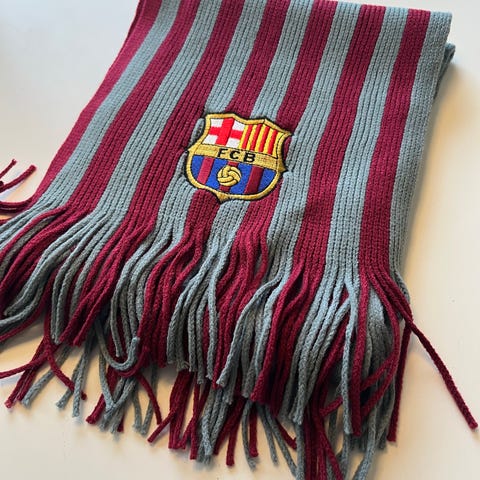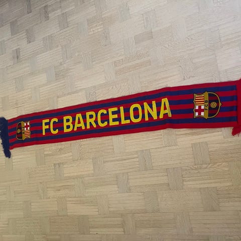 FC Barcelona halstørklæde - officielt FC Barcelona merchandise i røde og blå farver med klubbens logo. Længde ca. 150cm, bredde 20cm. Aldrig brugt. Købt på Camp Nou. Kan hentes i Brønshøj eller købes via Fiks Færdig.