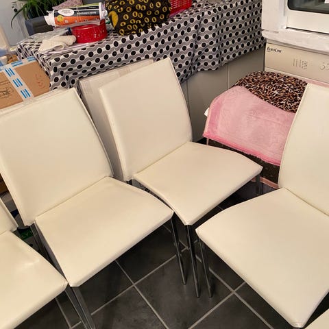 6 superflotte design-stole i imiteret læder og metal. Sælges kun fordi den ny cafelejer har sin egne stole med. Pris for alle 6 stole 300 kr. eller kr. 100 pr. styk.