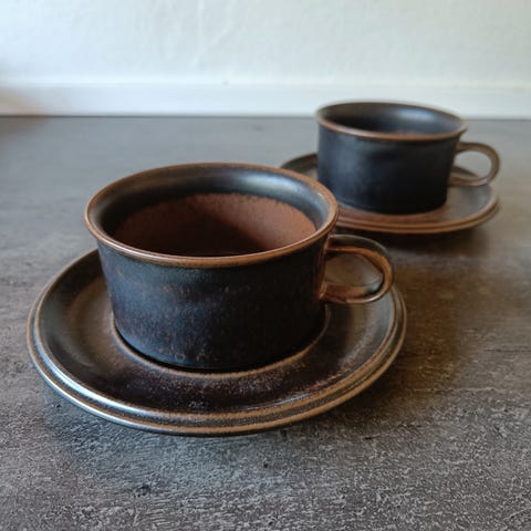 7 par tekopper (kop og underkop) i stentøjsstellet Karelia fra Arabia.