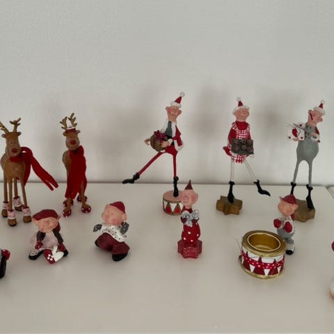 Gustav Nisse julefigur med rød hue og hvide handsker med røde prikker. Figuren bærer grå bukser og har røde og hvide stribede sokker. Fremstillet i materialer egnet til dekoration i julen.