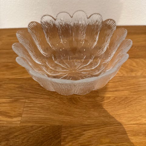 Holmegaard glas skål i klart glas med blomsterformet design. Skålen har en tekstureret overflade og en diameter, der gør den velegnet til servering eller dekoration. 17 cm i diameter og 9 cm i højde
