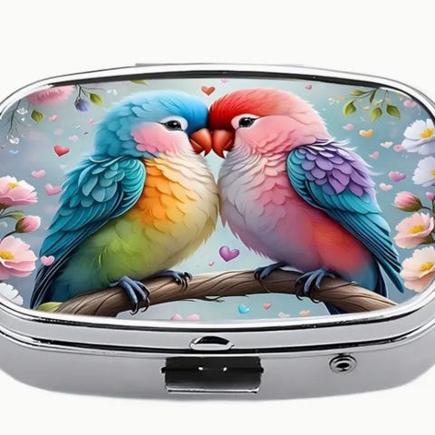 SUPER SØD PILLEÆSKE med et charmerende motiv af TO HAVODDERE I VAND MED LOTUSBLOMSTER. Motivet er under (plexi)glas og æsken indeholder to rum, se billede nr. to. Æsken er sølvfarvet og den er 4x5,5 cm. Pilleæsken er helt ny. Vægt 32 gram