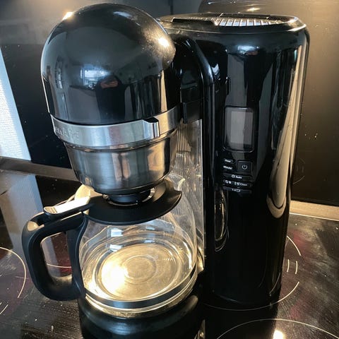 KitchenAid kaffemaskine med en kapacitet på 1,25 liter. Sort farve med glas kande. Udstyret med digitale knapper til indstilling af tid og brygning. Inkluderer permanent filter til kaffebønner. Velegnet til hjemmebrug.