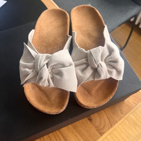 sandaler i størrelse 37. Sandalerne er beige og har en åben tå med en bred rem over foden. Hælhøjden er moderat, og materialet har en ribbet tekstur. Designet er uden lukning og egnet til casual brug.