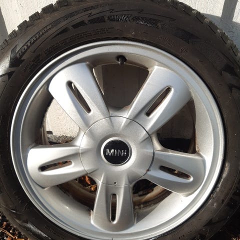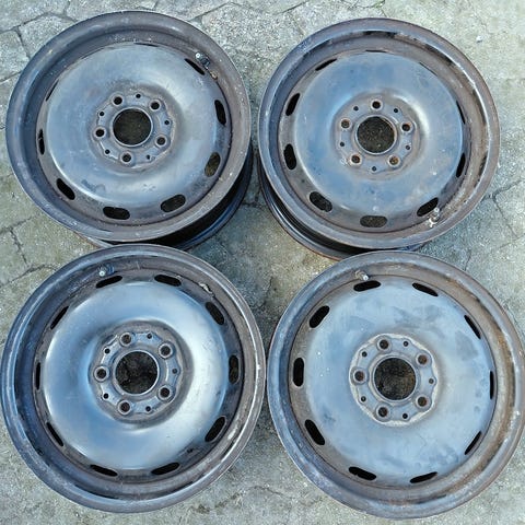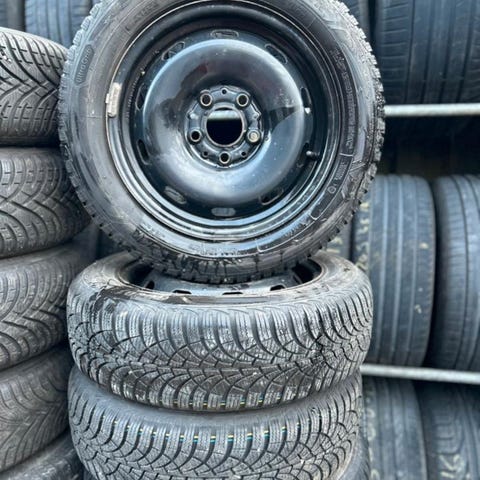 Sælger et sæt på fire komplette hjul med stålfælge og vinterdæk.