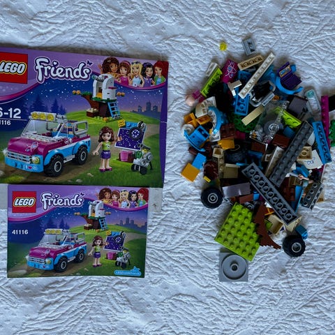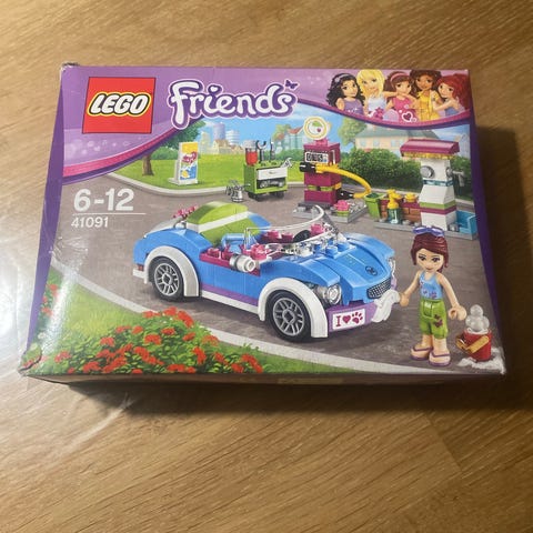 LEGO Friends 41301 Bil med Hundetema, egnet til børn i alderen 5-12 år. Sættet indeholder en hvid og lilla bil med detaljer som en hundetunge og øjne på fronten, samt figurer og tilbehør relateret til hunde. Materialet er plastik, og sættet er en del af LEGO Friends-serien.