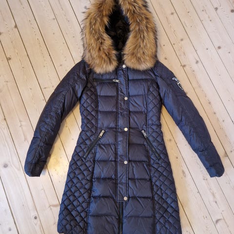 Mellemlang dun jakke med super flot ægte ræv pels hætte i perfekt stand