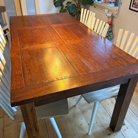 Stilfuldt spisebord sælges. Kun mindre brugsspor uden praktisk betydning. Ingen store skrammer/ridser. Ikke-ryger hjem. Ny pris 3800 kr.