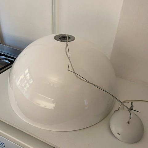 Smuk og ikonisk FLOS Skygarden 2 pendel i Glossy White med klassisk hvid stuk indvendig.
