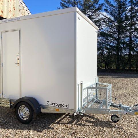 mobil badevogn trailer med integreret bruser og toilet. Trailerens indvendige rum er udstyret med en bruser med håndbruser, et toilet samt en vask med armatur. Der er et lille vindue for ventilation og naturligt lys. Trailerens ydre er hvid med låsbar dør for adgang til det indvendige rum. Trailerens konstruktion gør den egnet til transport og midlertidig brug som bade- og toiletfacilitet.