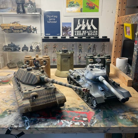 To fjernstyrede tanks der kan køre, rotere og skyde på hinanden og 1 tårn, som roterer mens det skyder og “eksploderer” når det ikke har flere liv. Kører på AA batteri. Kan sende videoer, hvor man kan se det hele virker. Købt ved morfars.dk. I virkelig god stand. Sælges kun samlet. Nej tak til skambud.