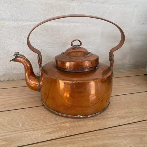 Kande kedel i kobber med patina, kan formentlig sagtens pudses op det må købes selv gøre hvis det ønskes.