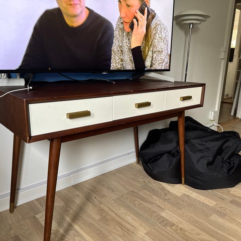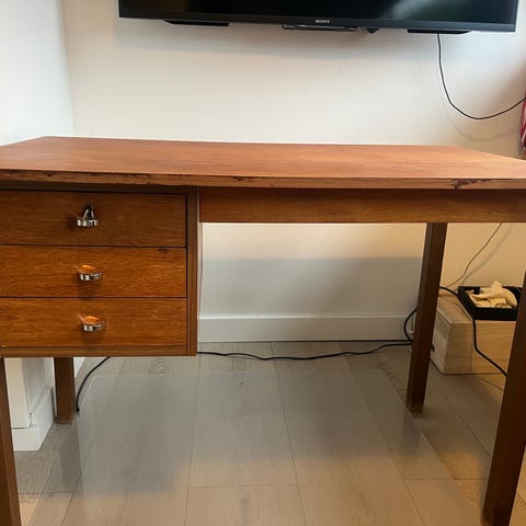 Skrivebord i massivt træ, maling er slidt at nogle steder.