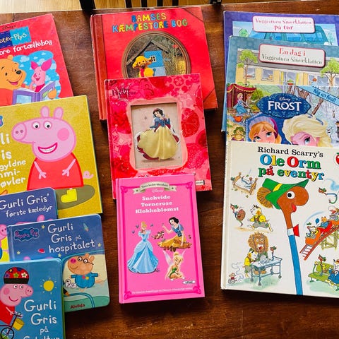 Samling af blandede børnebøger med forskellige titler, farverige illustrationer og varierende størrelser. Indeholder bøger med forskellige temaer, herunder dyr, eventyr og læring. Velegnet til børn og samlere af børnelitteratur.