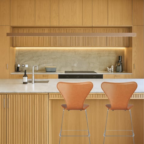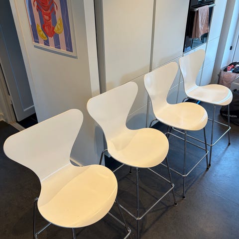 Fritz Hansen Arne Jacobsen Series 7 barstol i orange med sæde og ryg i formpresset træ og stel i stål. Stolen har en slank og moderne konstruktion, der passer til barhøje borde. Designet af Arne Jacobsen, kendt for sin minimalistiske og funktionelle stil. Barstolen viser brugsspor med små ridser på sædet og ryggen.(se fotos)