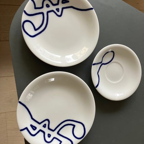 Royal Copenhagen Musica - Monica Ritterban. Underkopper, sæt bestående af 5 stk. tallerkener. underkopperne er hvide med blå dekorative mønstre. Materialet er porcelæn, og de egner sig til servering af mad. Designet er enkelt og tidløst.