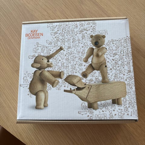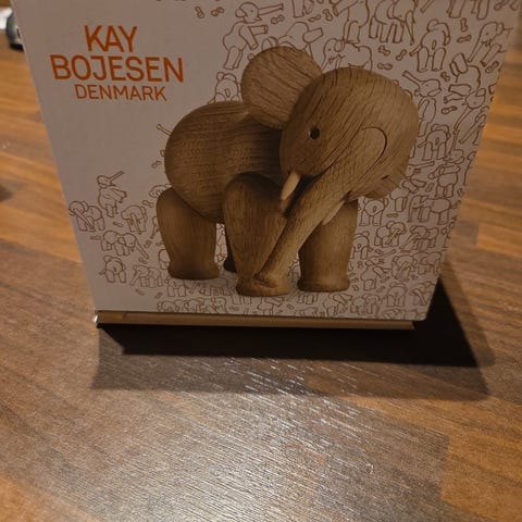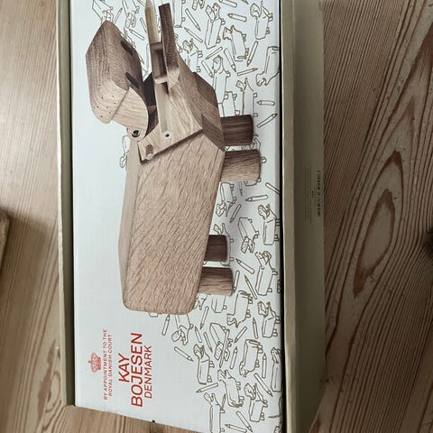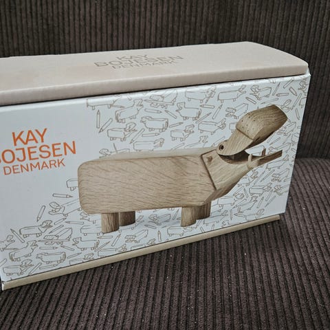 Kay Bojesen lilliput Hippe (næsehorn) udskåret i smukt egetræ. Ligger ubrugt i original æske fra ikke ryger hjem. Måler 6 cm i højden, bredde 3,5 cm Længde 14 cm. En Kay Bojesen samler genstand som man kun bliver i godt humør af. Nypris 500,-