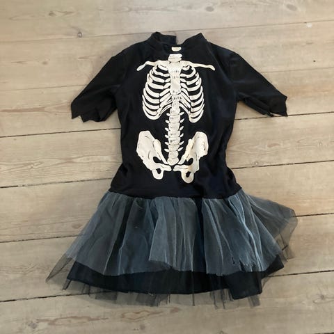 Kjole til halloween med hvidt skeletmotiv på brystet, nederdel med røde volanger og motiver af dødningehoveder og blomster i hvidt, grønt, rødt og lilla, grøn.
