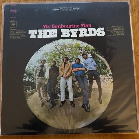 The Byrds Mr. Tambourine Man Vinyl LP featuring tracks such as 'Mr. Tambourine Man,' 'All I Really Want To Do,' and 'The Bells of Rhymney. Fin stand