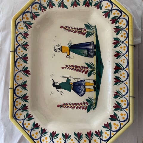 HB Quimper keramisk fad fra Quimper, Frankrig. Fadet har et håndmalet motiv af en kvinde iført traditionelt tøj i blå, gul og rød farve. Fadet er dekoreret med blå og røde kanter og grønne blade. Materialet er keramik, og det har en unik form med en lille hank. Produktet har brugsspor og enkelte revner, som ses på billederne.