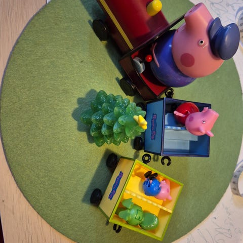 Gurli Gris Tog Legetøj består af et rødt lokomotiv med en førerfigur og to vogne med yderligere figurer. Toget er lavet af plast og træmaterialer og er designet til børn. Legetøjet kan bruges til leg og udvikling af børns fantasi og motoriske færdigheder.