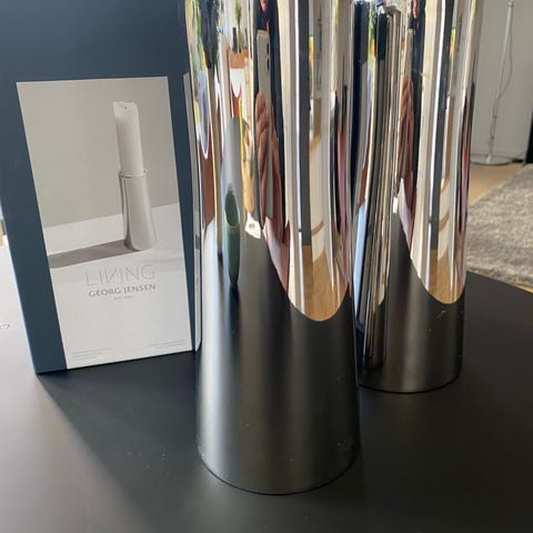 Georg Jensen Lysestage Medium, 2 stk. Fremstillet i metal med en højde på 200 mm. Designet af Constantin Wortmann. Passer til standard stearinlys og kan bruges som dekorative lysestager i hjemmet.