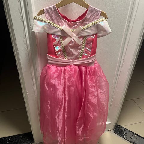 Udklædning Unicorn kjole i størrelsen 122 til piger. Kjolen er lyserød med flerfarvede, transparente lag og har korte ærmer. Materialet er let og egnet til børns brug. Inkluderer et tilhørende hårbøjle med enhjørningstema i guld og lyserøde farver.