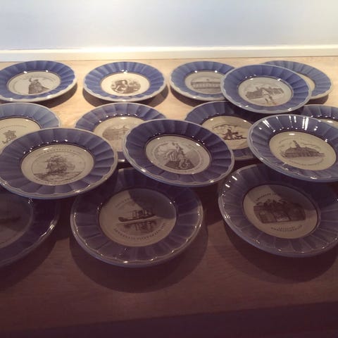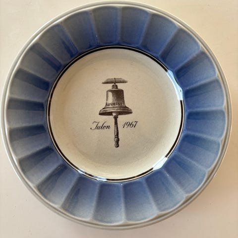 Porcelænstallerken med motiv af en vindmølle og teksten 'Søværnet Julen 1953'.