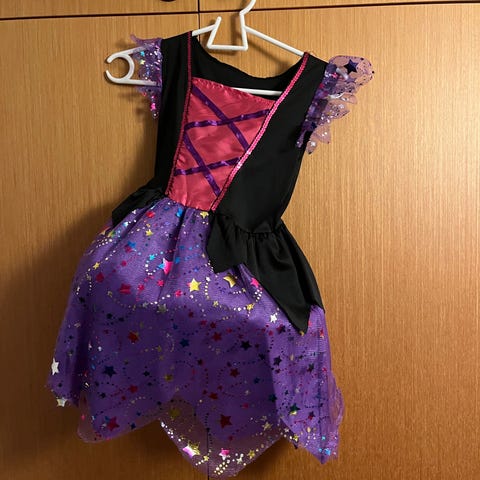 Halloween heksekjole og hat i størrelse 128 til piger. Kjolen er lilla og har detaljer, der gør den velegnet til udklædning eller leg.