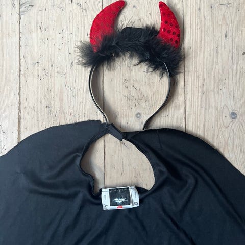 Halloween udklædning unisex børnetøj i størrelse 128, sort farve. Materialet er polyester. Sættet inkluderer en heldragt med hætte og kappe samt en sort maske. Velegnet til børn og kan bruges til kostume eller leg.