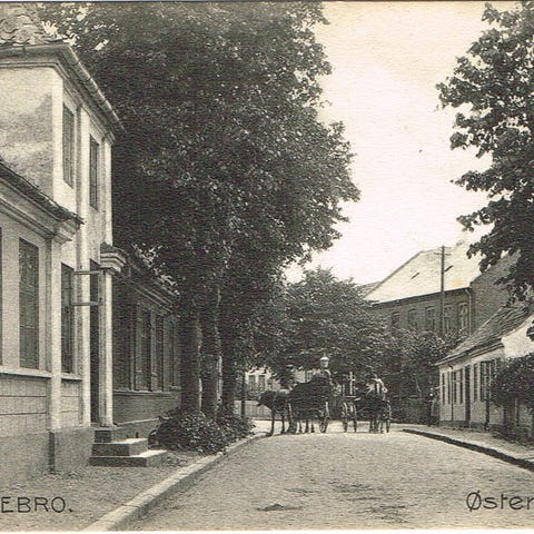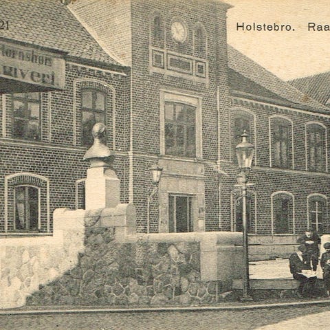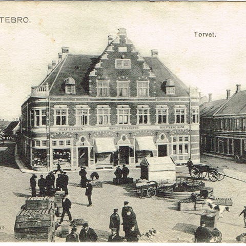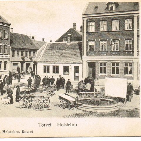Farvekort med masser af mennesker og kærrer. Sendt fra Holstebro til Ribe med ankomst 31.1.1906 med Chr. 9 5 øres frimærke. Forsendelse 25 kr.